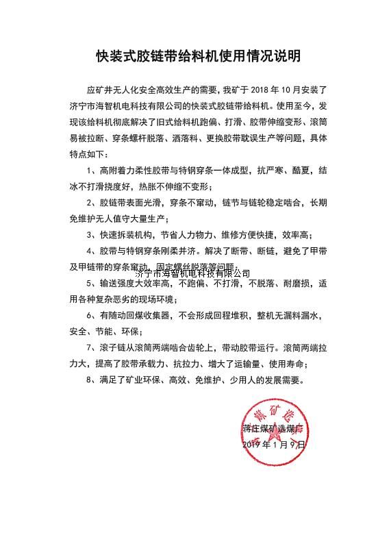 快裝式膠鏈帶給料機(jī)可實(shí)現(xiàn)完美替代物料運(yùn)輸系統(tǒng)在用的所有形式的給料機(jī),包括甲帶給料機(jī)、帶式給料機(jī)、振動給料機(jī)、往復(fù)式給料機(jī)、鏈板給料機(jī)等,膠鏈帶給料機(jī)更好的解決了跑偏、打滑、換裝困難等問題,更利于實(shí)現(xiàn)快速裝車、高效自動化的現(xiàn)代智能運(yùn)輸系統(tǒng)要求。
